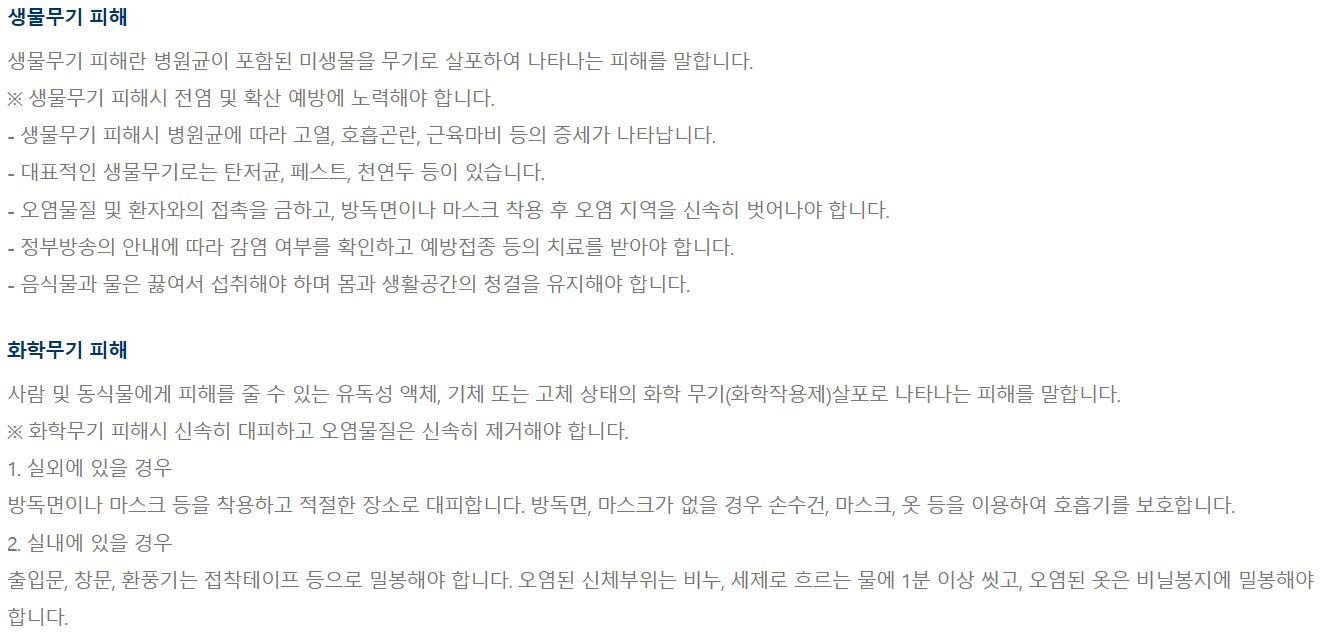 - 핵 또는 방사능 피해 관련해서는 국가에서 지정해놓은 대피요령을 참고하셔야겠습니다.